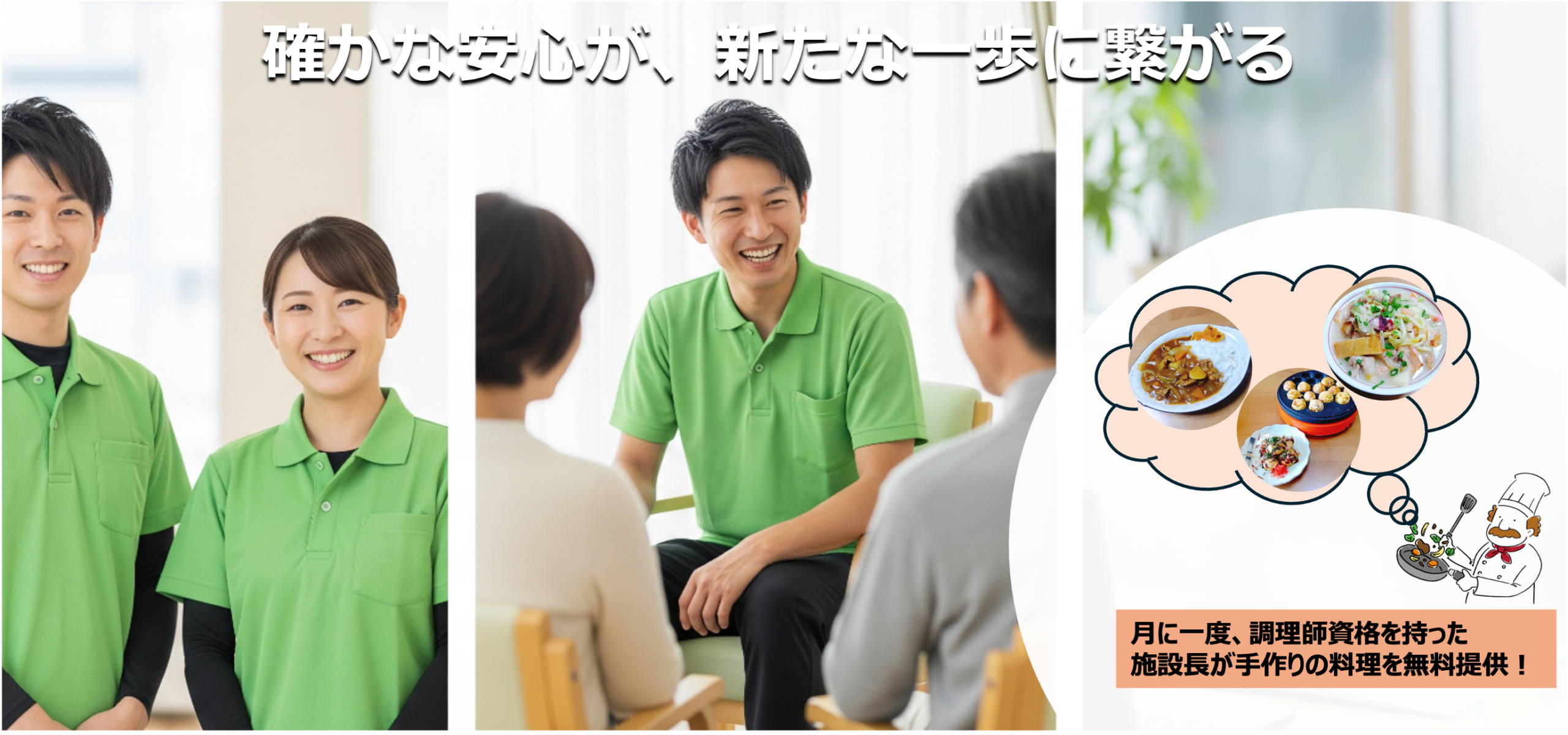 経験豊富なスタッフが24時間体制で見守り、日々の健康管理から緊急時の対応まで、万全のサポート体制を整えています。心から安らげる「我が家」を目指します。